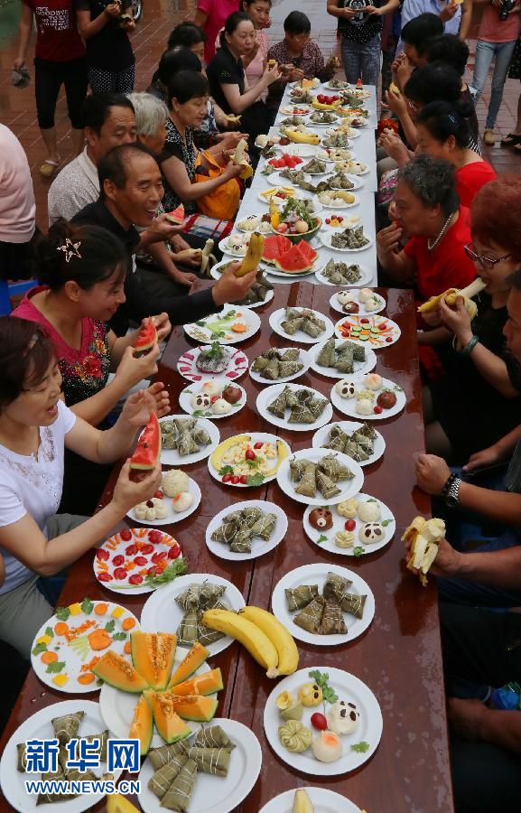 6月19日,沧州市运河区迎宾社区居民在“和谐邻里迎端午”活动上共享粽子宴。当日,河北省沧州市运河区迎宾社区举行“和谐邻里迎端午”活动,社区居民聚在一起包粽子、品粽香、表演文艺节目,共迎端午佳节的到来。新华社发(傅新春 摄)