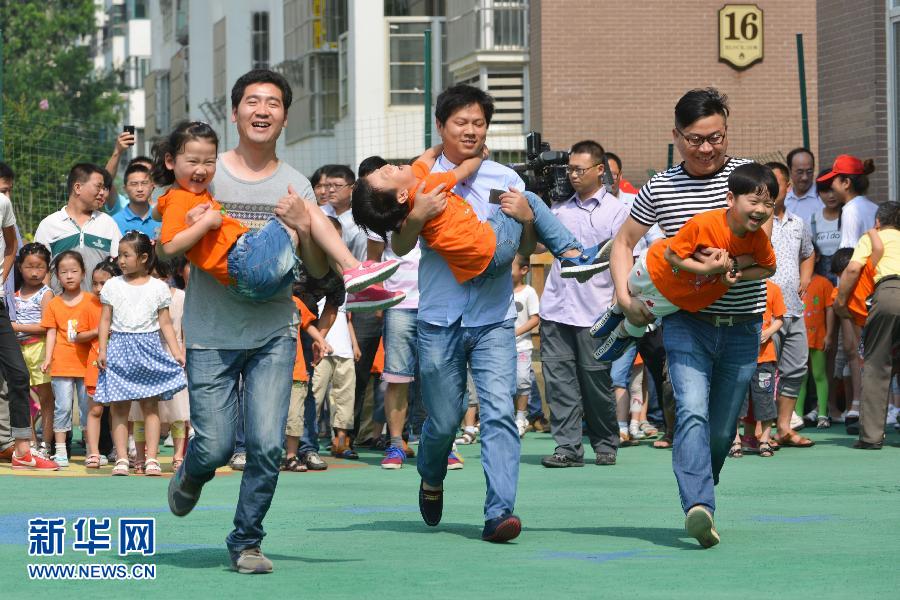 6月19日,父亲抱着孩子赛跑。当日,合肥市和平路街道裕溪路社区举办“大手牵小手,爸气向前冲”父亲节主题活动迎接即将来临的父亲节。活动中,社区孩子们通过和自己的爸爸体验“爸气向前冲”“过山洞”等各种互动趣味运动游戏,让孩子们感恩浓浓的父爱。新华社记者 杜宇 摄