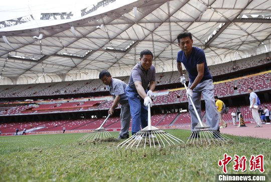 6月18日,工作人员在北京的国家体育场(鸟巢)整理场地。中新社发 杜洋 摄