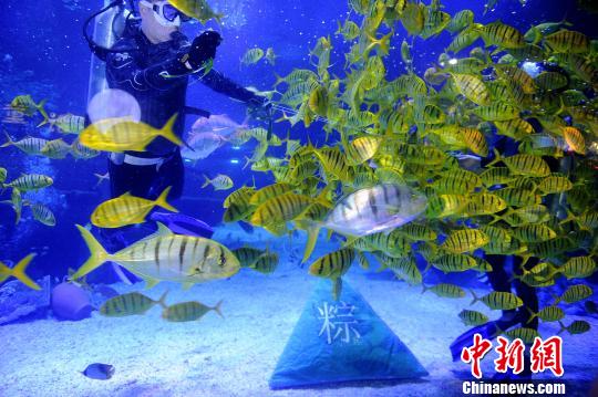 6月18日,为了让可爱的海底精灵一同享受端午节“传统美食”,天津海昌极地海洋世界的潜水员们,首次给鱼儿们准备了特别的“粽子宴”,这些粽子里包裹着它们爱吃的虾仁、鱿鱼、蔬菜等,海味十足。佟郁 摄