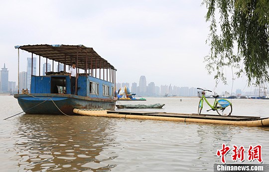 一渔民将船泊在江边,水位上涨后靠边就可以骑着自行车上路。姜涛 摄