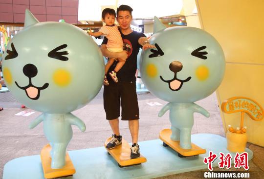 父亲带着孩子学着模型的样子拍照。李珂 摄
