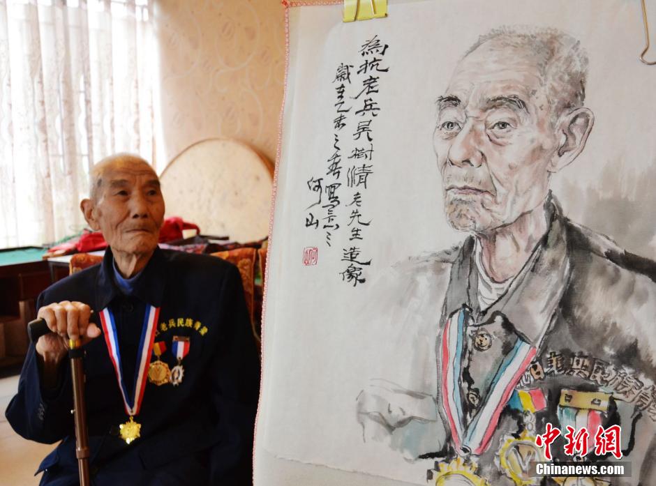 从6月18日开始,由四川志愿者和画家联合组成的关爱抗战老兵组织来到泸州叙永,开始为这一地区的老兵画像。画家们表示,希望通过给各地的抗战老兵画像,可以以此种特殊的形式将抗战精神留住。而这些画像将作为纪念世界反法西斯战争胜利70周年的礼物,赠予建川博物馆和一些地方博物馆用于永久纪念收藏。图为老兵们展示他们的画像。中新社发 周亚强 摄