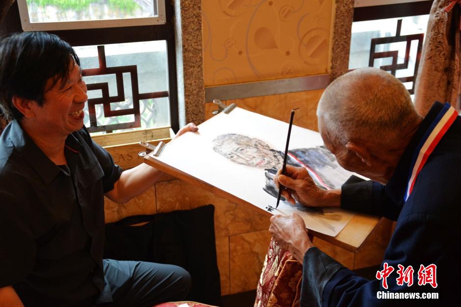 从6月18日开始,由四川志愿者和画家联合组成的关爱抗战老兵组织来到泸州叙永,开始为这一地区的老兵画像。画家们表示,希望通过给各地的抗战老兵画像,可以以此种特殊的形式将抗战精神留住。而这些画像将作为纪念世界反法西斯战争胜利70周年的礼物,赠予建川博物馆和一些地方博物馆用于永久纪念收藏。图为91岁老兵邢均为自己的画像签名。中新社发 周亚强 摄
