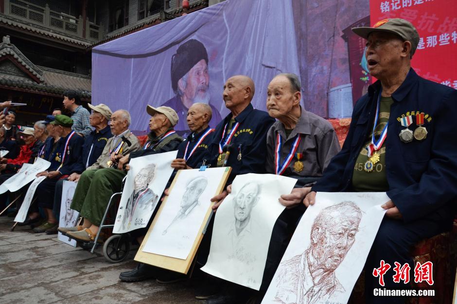 从6月18日开始,由四川志愿者和画家联合组成的关爱抗战老兵组织来到泸州叙永,开始为这一地区的老兵画像。画家们表示,希望通过给各地的抗战老兵画像,可以以此种特殊的形式将抗战精神留住。而这些画像将作为纪念世界反法西斯战争胜利70周年的礼物,赠予建川博物馆和一些地方博物馆用于永久纪念收藏。图为老兵们展示他们的画像。中新社发 周亚强 摄