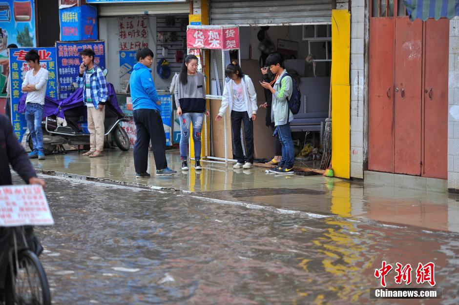 6月19日,市民被困人行道。一夜不停的大雨让昆明城区部分路段严重积水,市民出行受阻。中新社发 刘冉阳 摄