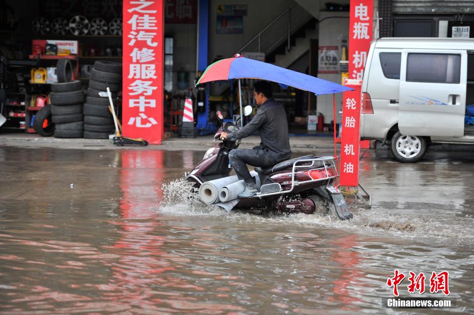 6月19日,市民从积水里骑车驶过。一夜不停的大雨让昆明城区部分路段严重积水,市民出行受阻。中新社发 刘冉阳 摄