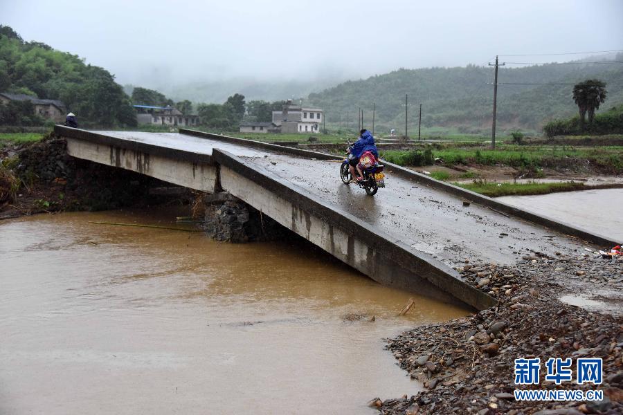 一辆摩托车从湖北省崇阳县山坪镇被山洪冲断的桥上驶过(6月17日摄)。