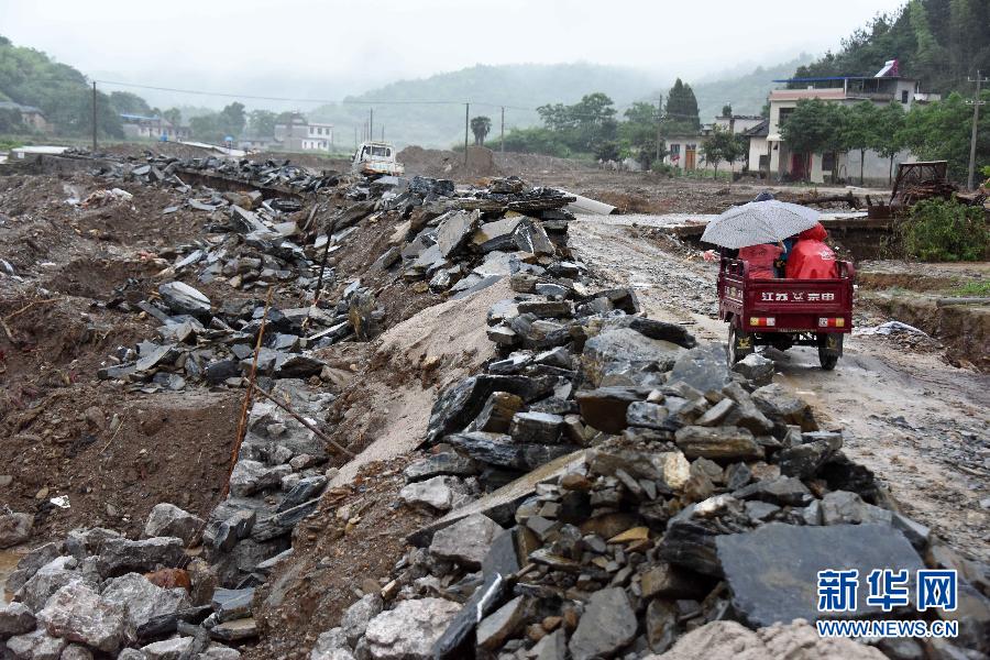 一辆三轮车在湖北省崇阳县沙坪镇一处被山洪冲毁的道路上艰难行驶(6月17日摄)。