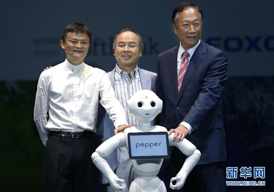 6月18日,在日本东京举行的机器人Pepper发布会上,日本软银集团总裁孙正义(中)、阿里巴巴集团董事局主席马云(左)及富士康科技集团董事长郭台铭和机器人Pepper一起亮相。阿里巴巴、日本软银集团、富士康科技集团18日共同宣布达成协议,阿里巴巴、富士康将向软银旗下的软银机器人控股公司(SBRH)分别注资145亿日元,完成注资后,阿里巴巴、富士康将分别持有SBRH20%股份,软银则将持有60%股份。据介绍,机器人Peper“具备情感”,机器人头部装有麦克风、摄像头和3D传感器,对人的表情、声调到喜悦及愤怒等感情均可识别,并且可根据人类情绪进行反应。新华社/美联