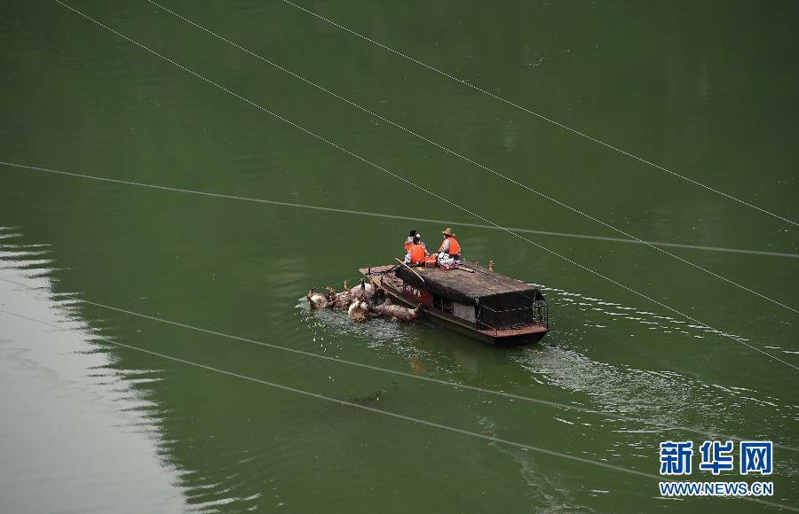 6月18日,打捞人员在广西大化瑶族自治县六也乡加司村打捞死猪。当日,广西大化瑶族自治县组织打捞队伍开始打捞死猪,已有数百头死猪被集中到填埋点附近,待填埋点挖好后将进行无害化处理。6月14日,暴雨洪灾导致广西大化瑶族自治县六也乡一养殖场被淹,1.6万头猪被淹死。新华社记者 黄孝邦 摄