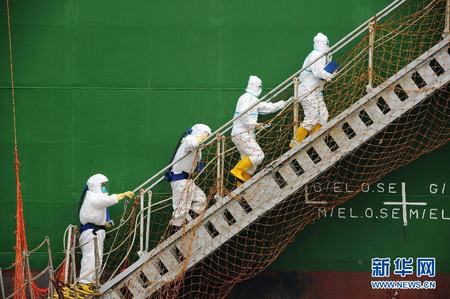 6月18日,在山东青岛港外贸集装箱码头,流行病学调查人员演练登轮进行流行病学调查。 当日,一场以处置“中东呼吸综合征”病例为主题的应急演练在山东青岛港外贸集装箱码头举行。演练分为登轮人员个人防护、检疫查验与流行病学调查、疫情报告与预案启动、现场封控、病例移交、密切接触者的流行病学调查、船舶卫生处理等程序进行,青岛地区的检验检疫、卫生、边检和港口等部门的工作人员参加了演练。新华社发(俞方平 摄)