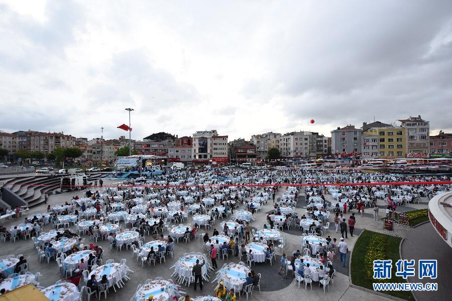 6月18日,在土耳其伊斯坦布尔的宰廷布尔努地区,人们等待日落后就餐。当日,伊斯坦布尔各城区为市民提供免费晚餐,庆祝斋月首日。在该市宰廷布尔努地区,约3000名市民在日落后领取了政府提供的免费晚餐。新华社记者贺灿铃摄