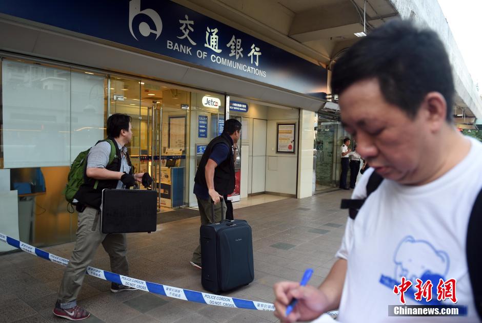 6月18日,香港警方进入沙田好运中心交通银行封锁现场。当日下午4时许,警方接报,一名行劫男子手持两瓶易燃液体进入银行,挟持了一名女职员。警方最后成功将该名男子制服。警方向记者证实,该名身穿白色上衣、深色长裤的男子已被警方控制,暂时没人受伤。中新社发 张宇 摄