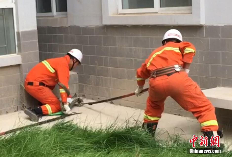 6月17日,甘肃甘谷县一小区闯入一条蟒蛇,手臂粗壮的大蛇盘卧在小区草丛内休息,约两米多长,赶来的消防官兵用火钩按住大蛇头部,防止它回头咬人,另一人抓住蛇尾和“七寸”,成功将其擒住。据了解,此蟒蛇属无毒蛇类,性格温顺,是国家一级保护野生动物。抓获后,消防官兵挑选偏僻的山上将其放归大自然。钟欣 摄