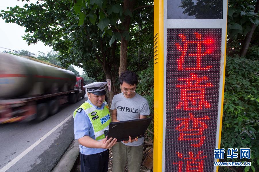 6月16日,白涛公路巡逻大队大队长冉滨(左)和技术人员在对弯道智能会车预警系统的显示屏进行日常维护调试。日前,重庆市首个弯道智能会车预警系统经过近3个月的测试运行,在涪陵区白涛街道附近的319国道一段急弯公路上正式投用。这套弯道会车预警系统通过在弯道两端预埋式(或道钉式)铺设的路面无线传感器,实时采集过往车辆速度等行驶数据,并发到路旁的预警显示屏上,提醒过往驾驶员前方对向车道车辆行驶的信息,从而有效提醒驾驶员减速谨慎驾驶通过弯道。据涪陵区公安分局交巡警支队白涛公路巡逻大队大队长冉滨介绍,这套系统实现了减速提醒和弯道路况提醒的功能,非常适合丘陵地貌、弯急坡陡的319国道等山区道路,测试运行期间该事故多发路段因弯道超车、强行超车会车导致的交通事故下降超过45%。未来交巡警部门还将结合辖区的实际情况在319国道上交通事故易发地区对弯道智能会车预警系统进行推广使用。新华社记者 刘潺 摄