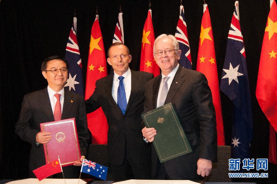 6月17日,在澳大利亚首都堪培拉国家美术馆,中国商务部部长高虎城(左)和澳大利亚贸易与投资部部长安德鲁·罗布(右)在分别代表两国政府正式签署《中华人民共和国政府和澳大利亚政府自由贸易协定》后与澳大利亚总理托尼·阿博特合影。新华社发(钱军摄)
