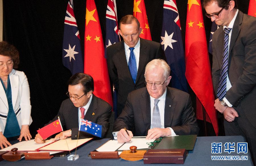 6月17日,在澳大利亚首都堪培拉国家美术馆,中国商务部部长高虎城(左二)和澳大利亚贸易与投资部部长安德鲁·罗布(右二)分别代表两国政府正式签署《中华人民共和国政府和澳大利亚政府自由贸易协定》。澳大利亚总理托尼·阿博特(中)出席签字仪式。新华社发(钱军摄)
