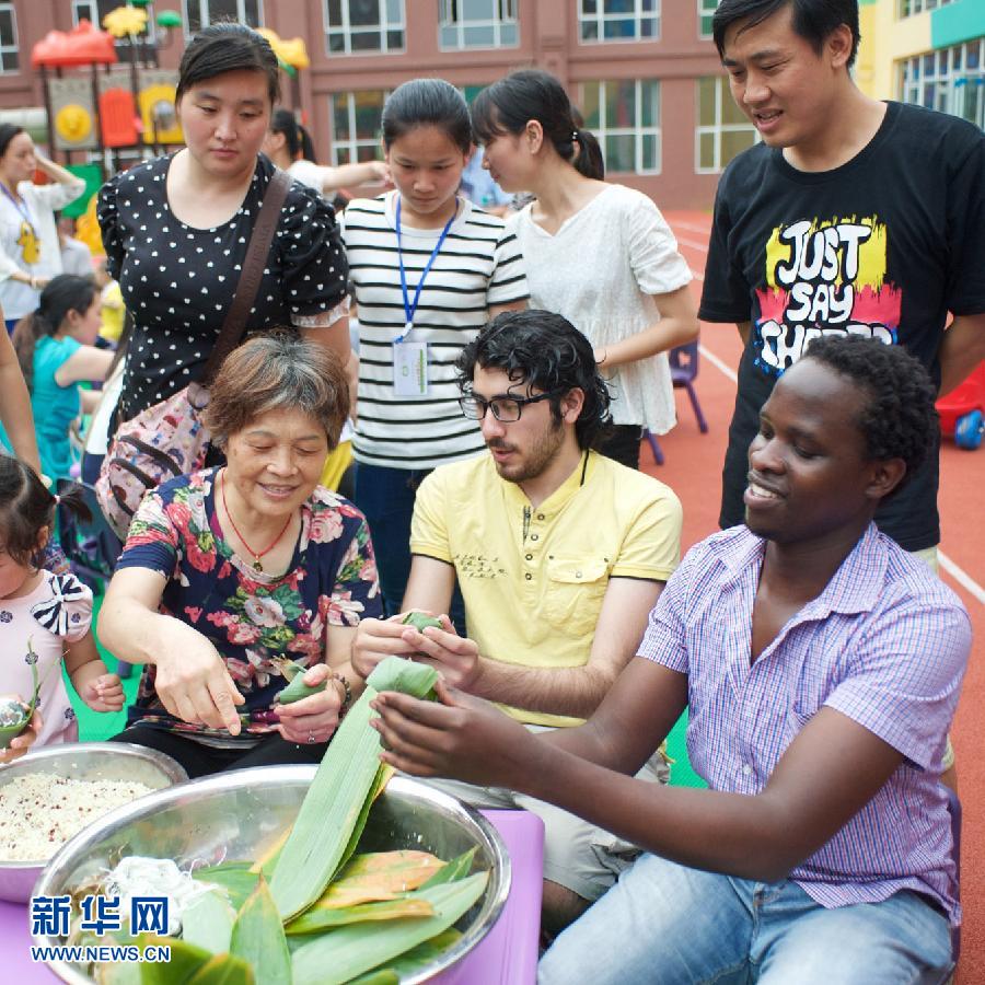 6月17日,来自英国的杰森(前右一)和来自约旦的汉森(前右二)在江西南昌青山湖区水榭尚都新世纪幼儿园举办的包粽子比赛中,向居民学习包粽子。端午节临近,不少在中国工作学习的外国人走进社区,向居民学习包粽子,近距离感受中国传统文化。 新华社记者胡晨欢摄