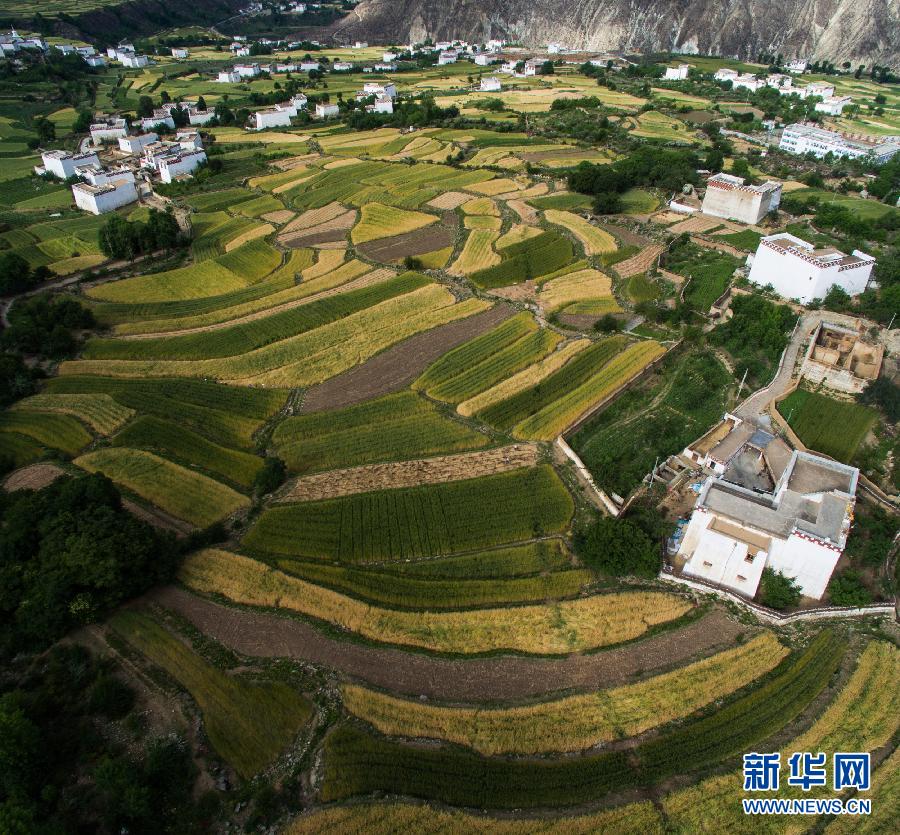 四川省乡城县两万多亩青稞、小麦等农作物逐渐进入成熟收割期,从高处俯瞰,白色藏房像一颗颗珍珠点缀在青黄相间的田园,形成一幅藏乡田园美丽画卷。当地加强基础设施建设,农、旅、文融合发展,打造藏乡田园旅游目的地,成为稻城亚丁环线游上的一颗明珠。新华社记者江宏景摄