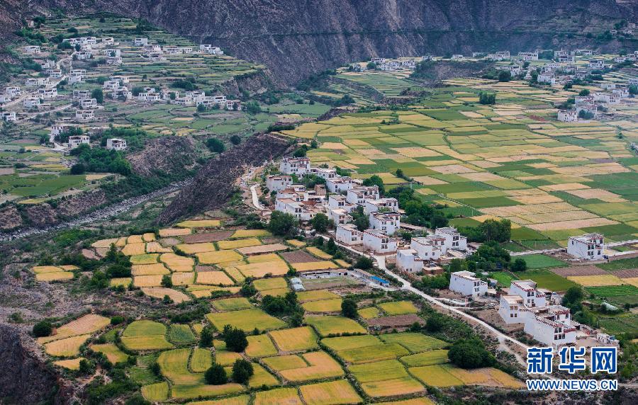 四川省乡城县两万多亩青稞、小麦等农作物逐渐进入成熟收割期,从高处俯瞰,白色藏房像一颗颗珍珠点缀在青黄相间的田园,形成一幅藏乡田园美丽画卷。当地加强基础设施建设,农、旅、文融合发展,打造藏乡田园旅游目的地,成为稻城亚丁环线游上的一颗明珠。新华社记者江宏景摄