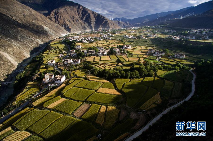 四川省乡城县两万多亩青稞、小麦等农作物逐渐进入成熟收割期,从高处俯瞰,白色藏房像一颗颗珍珠点缀在青黄相间的田园,形成一幅藏乡田园美丽画卷。当地加强基础设施建设,农、旅、文融合发展,打造藏乡田园旅游目的地,成为稻城亚丁环线游上的一颗明珠。新华社记者江宏景摄