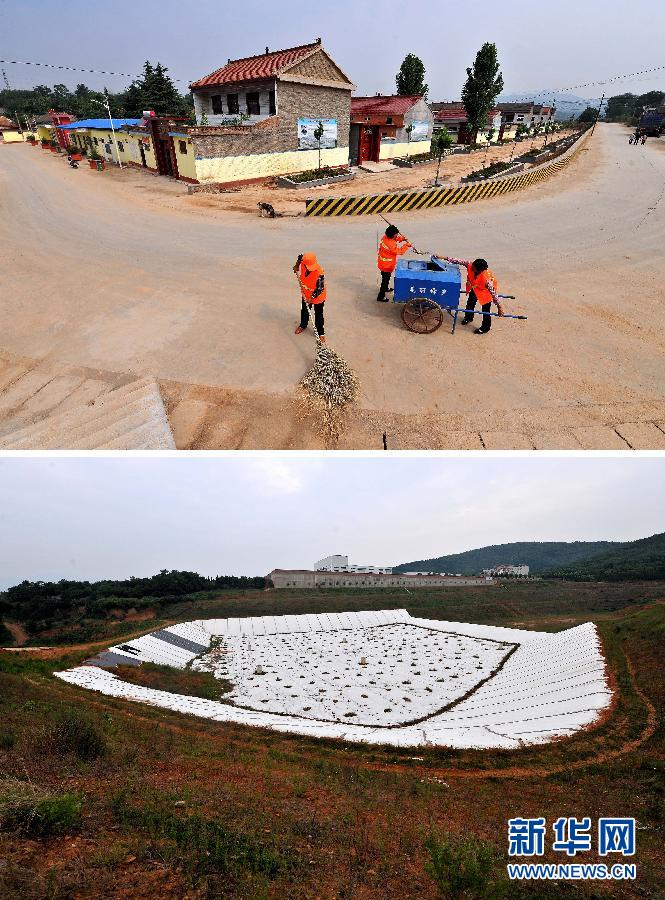 上图为垣曲县皋落乡岭回村乡村环卫工在清扫街道;下图是将于7月投入使用的垣曲县垃圾综合处理场垃圾填埋场,日处理生活垃圾270吨,可满足全县的生活垃圾处理需要(6月16日摄,拼版照片)。为改善农村人居环境,解决农村生活垃圾的堆积问题,近年来,山西省垣曲县大力开展农村环境面貌综合整治工作,探索出“户收集、村清运、乡镇集中填埋”的垃圾治理之路。过去,垣曲县农村群众处理垃圾的方式大多是随意堆放或直接焚烧。自2013年起,当地政府建立了“机构、队伍、场所、工具、报酬、奖惩、记录、资金”的“八有”机制,在全县188个行政村聘请了500多位村民做乡村环卫工,村内放置了垃圾桶,每个村庄都建立了垃圾池。乡镇配备了垃圾清运车,统一将各村垃圾运往乡镇的垃圾填埋场处理。同时,对闲置用地实行绿化措施,使农村环境逐步实现“变脸”。如今,垣曲县垃圾围村的现象已“销声匿迹”,农村环境面貌得到较大改善。据了解,垣曲县还制定了《农村清洁工程长效管理办法》,今年将采取县干部包乡镇,乡镇干部包村,按照重点推进、分步实施的办法,继续实施农村环境连片整治,努力打造环境整洁、舒适宜居的美丽乡村。新华社记者 詹彦 摄