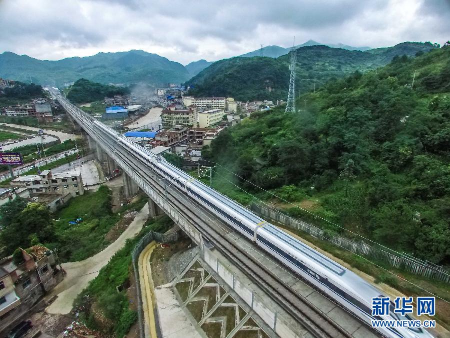 6月18日,首趟G3002次列车从贵州省贵定县境内驶过。当日,沪昆高铁贵阳至新晃段正式开通运营。据了解,沪昆高铁贵阳至新晃段全长286公里,开通初期运营时速300公里。该段高铁开通后,贵州省将全面接入全国高铁网络系统,通往华北、华东、华南方向均有动车通达。新华社记者 刘续 摄