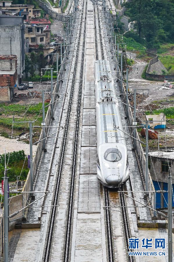 6月18日,首趟G3002次列车从贵州省贵定县境内驶过。当日,沪昆高铁贵阳至新晃段正式开通运营。据了解,沪昆高铁贵阳至新晃段全长286公里,开通初期运营时速300公里。该段高铁开通后,贵州省将全面接入全国高铁网络系统,通往华北、华东、华南方向均有动车通达。新华社记者 刘续 摄