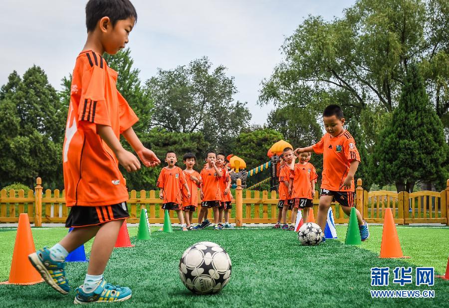位于北京玉泉山脚下的北京市六一幼儿院,成立于1945年的延安,是一所有着70年历史的“红色摇篮”。近日,该院建立了第一支幼儿足球队,并修建了近两百平方米的人工草皮球场,供孩子们玩耍和训练。在每次足球课上,这些5、6岁的小队员都会在绿茵场上尽情地奔跑,认真地训练,体现出对足球的喜爱。图为小球员们在练习带球绕桩(6月17日摄)。 新华社记者 毕晓洋 摄