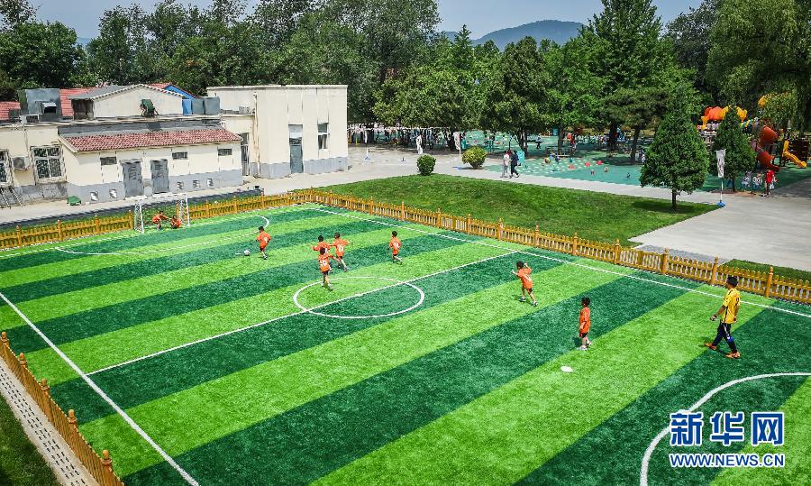 位于北京玉泉山脚下的北京市六一幼儿院,成立于1945年的延安,是一所有着70年历史的“红色摇篮”。近日,该院建立了第一支幼儿足球队,并修建了近两百平方米的人工草皮球场,供孩子们玩耍和训练。在每次足球课上,这些5、6岁的小队员都会在绿茵场上尽情地奔跑,认真地训练,体现出对足球的喜爱。图为小队员们在比赛中(6月17日摄)。 新华社记者 毕晓洋 摄