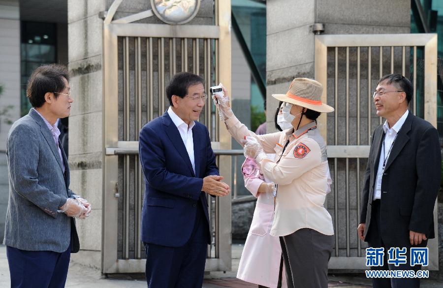 6月17日,在韩国首尔,光熙小学的一名工作人员为首尔市长朴元淳(左二)量体温。当日,韩国首尔市长朴元淳访问首尔市光熙小学,检查中东呼吸综合征防疫工作。据韩国保健福祉部最新通报,韩国中东呼吸综合征确诊患者增至162人,死亡患者20人,隔离对象为6508人。新华社发