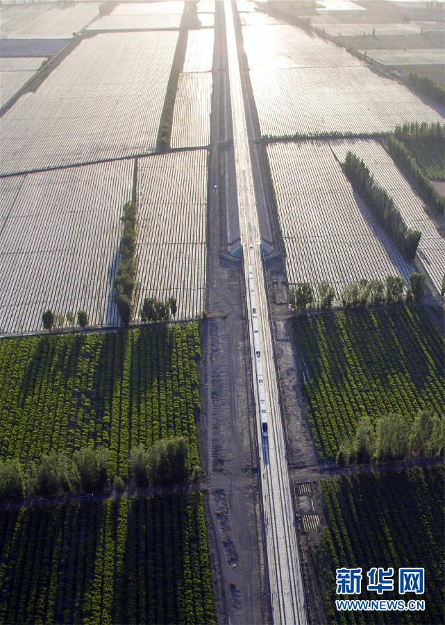 一辆动车从新疆哈密市近郊的葡萄架旁驶过(5月22日摄)。 新华社航拍小组摄