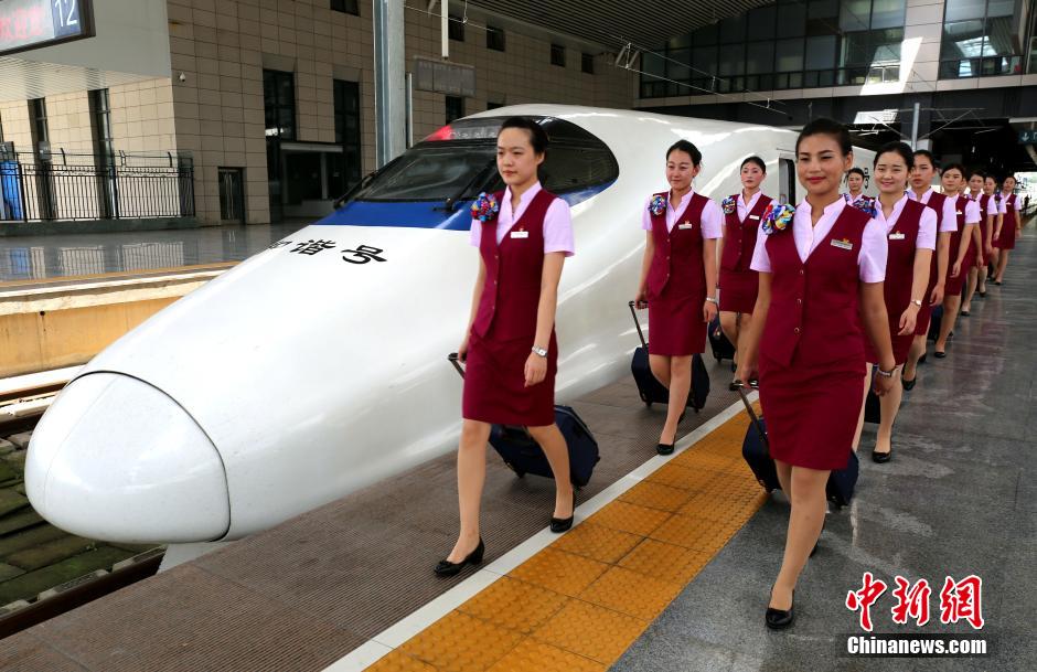 6月24日下午,合福高铁即将开通之际,南昌铁路局福州客运段担当合福高铁乘务工作的190名高姐穿上全新的制服,亮相福州火车站,吸引了过往旅客的目光。高姐们的新制服全部量身定做,枣红色的马甲、裙子和粉色衬衣配上漂亮的领花更显高姐们青春丽质。雍万俊 摄