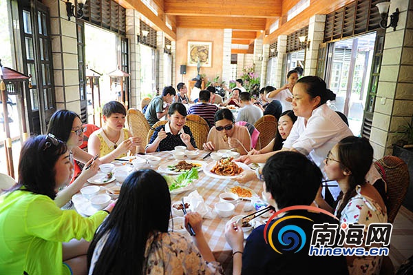 6月26日,“一带一路看海南”全国重点网络媒体海南行的网媒记者们在兴隆热带花园海南村里品尝东南亚风味的菜肴。(南海网记者沙晓峰摄)