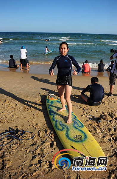 6月26日下午,冲浪归来的记者不忘拍照留念。(南海网记者沙晓峰摄)