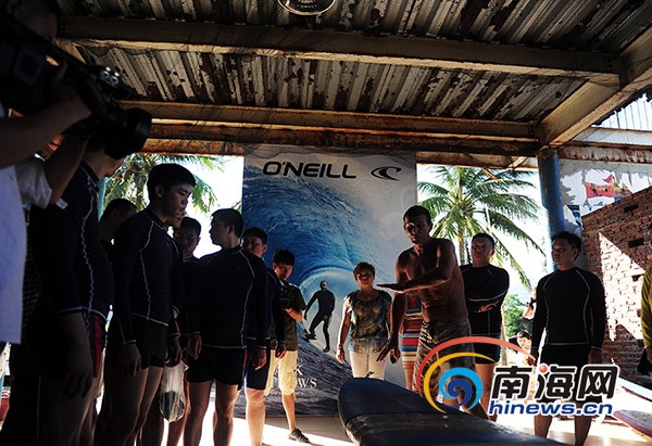 6月26日下午,来自德国的冲浪教练向记者们在讲解冲浪技巧。(南海网记者沙晓峰摄)