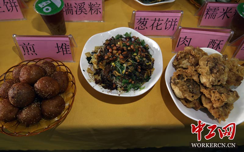 澄迈之旅,从美味满分的瑞溪美食风情小镇开始。在这个始建于清朝康熙年间,古老而繁荣的小镇,最出名的当属多种多样的特色美食,澄在迈瑞溪美食风情小镇参观、品尝特色小吃。三十多个品种的地方美味小吃汇聚在此,令现场媒体记者吃的大呼“过瘾”。图为当地名小吃的糕点展品。(中工网记者 毛邓摄)