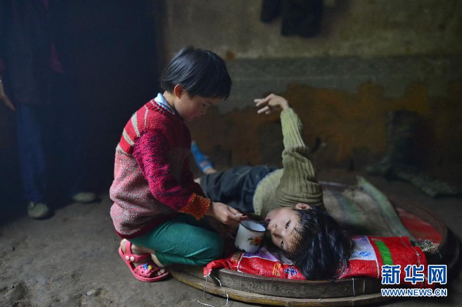 4月30日,大妹妹肖清秀(左)在给肖胜利喂水。新华社记者 周密 摄 图片来源:新华网