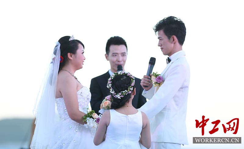 在婚礼现场,面对主持人提出,“无论生老病死,富贵贫贱,对林芳迪女士,你永远关心她,爱护她,不离不弃,你愿意吗?”新郎黄国兴的回答是,“yes I do。” (中工网记者 毛邓摄)