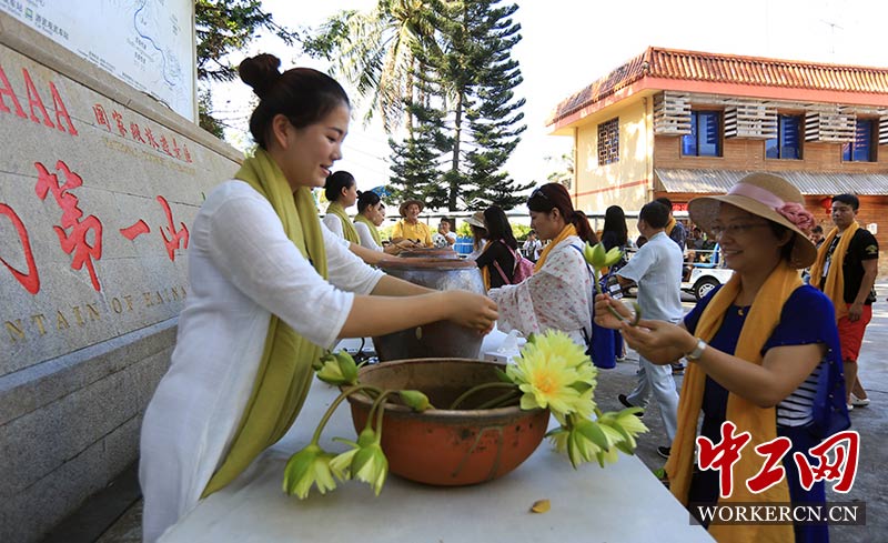 海南万宁东山岭虽有“海南第一山”的美誉,但它却不像很多的名山大川一样喧闹,不喜不悲。正是这份难得的宁静,让东山岭成为海南绝无仅有的天然禅修圣地。图为网媒行的记者在东山岭“金盘洗手”。 (中工网记者 毛邓摄)