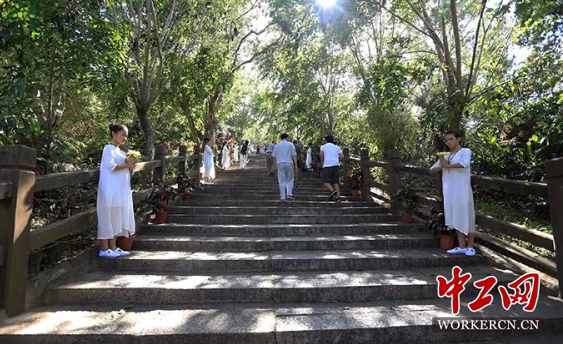 顺着石阶而上,一路上绿树成荫,路旁随处可见繁花异草,尽管夏日骄阳似火,但行走在翠鸟争鸣的林间石阶却感到清风送爽。一路上不难看见正在进行太极瑜伽和冥想打坐的人们,他们之所以选择在东山岭进行,正是这里的宁静,远离尘世喧嚣,伴随暮鼓晨钟,那悠扬的萧瑟奏乐,让身心在自然中得到全方位放松。 (中工网记者 毛邓摄)