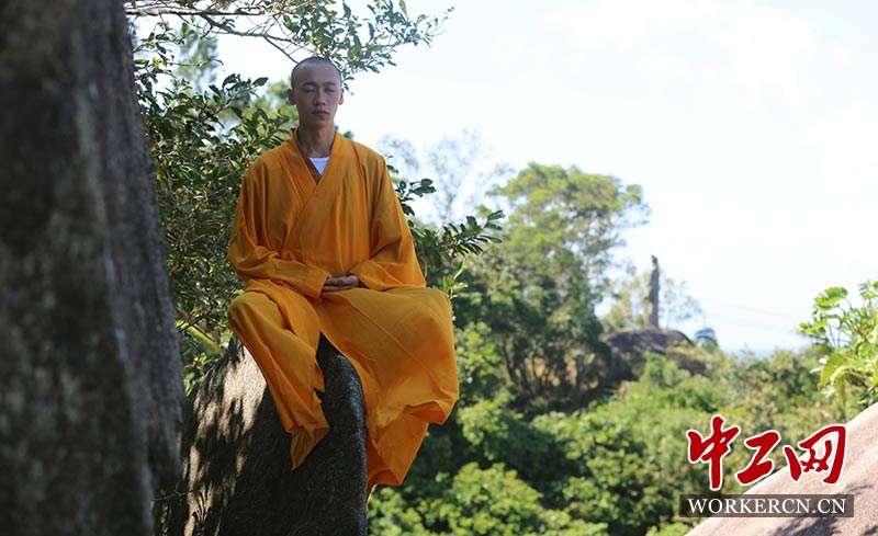 来到山腰,这里逶迤的山路上到处是嶙峋的怪石,每每到了“山穷水尽疑无路”时,却又见幽幽的山洞,或大或小,奇形怪状,穿洞而过,眼前豁然开朗。图为正在修行东山寺主持。 (中工网记者 毛邓摄)
