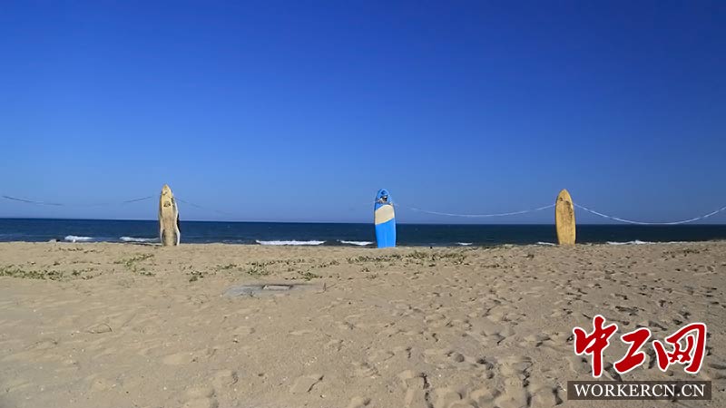 一个接一个海浪拍打在沙滩上,冲浪俱乐部里五颜六色酷炫的冲浪板,如舞者般在风口浪尖起舞的“浪人”。图为在冲浪俱乐部门前,直插在沙滩上做标时的冲浪板。 (中工网记者 毛邓摄)