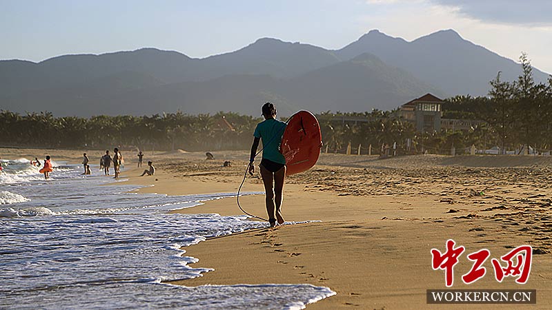 日月湾的傍晚是最为热闹的时候,每天都会有无数的当地冲浪爱好者来此处享受冲浪的激情时刻。图为一名女性冲浪爱好者,踏着落日余晖行走在沙滩上。 (中工网记者 毛邓摄)