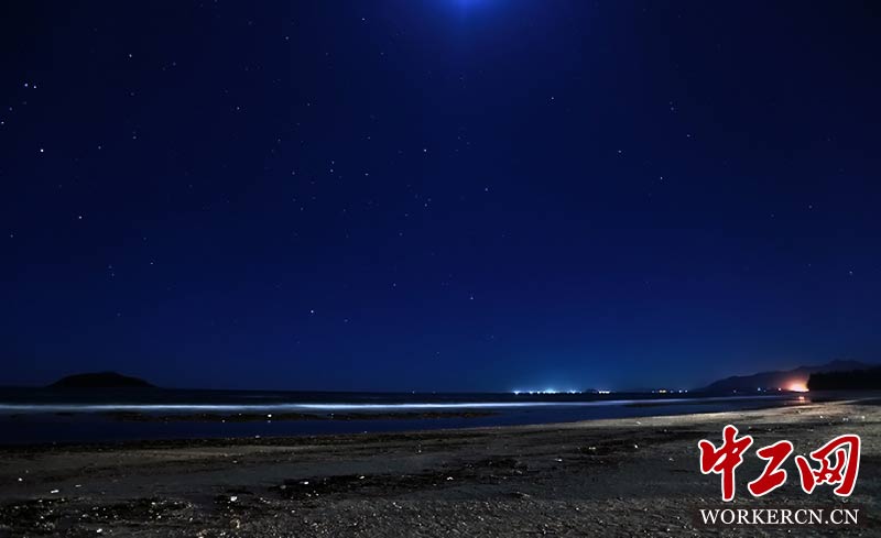 在海里,大家在海浪中扑腾翻滚,满是笑声,不少下海的网媒记者都在浪尖上站了起来,享受冲浪的快感。落日余晖已经洒在沙滩上,仿佛提醒着大家白天的冲浪可以结束了。等到晚上,繁星布满夜空,扛着相机来到沙滩上拍摄星空,一瞬间的定格就是无限的美景。 (中工网记者 毛邓摄)