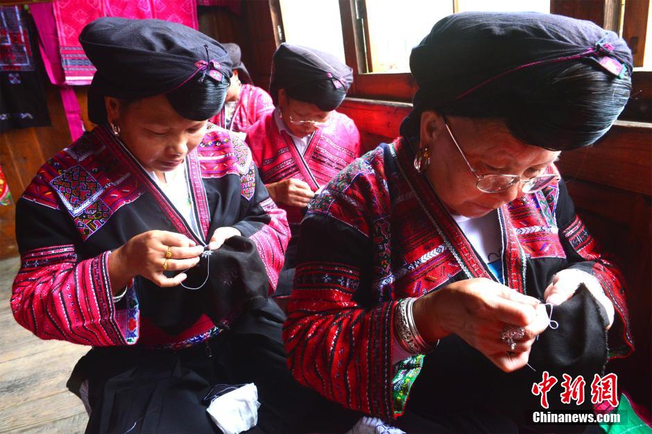 6月29日,广西桂林市龙胜各族自治县泗水乡迎来一年一度的传统“红衣节”,来自金坑、白面、孟山、细门等周边村寨的千余名红瑶群众会集潘内村,载歌载舞欢度“红衣节”。活动当天,民族歌舞盛宴、瑶家打旗工、红瑶刺绣大比拼、包粽子竞赛、水竹打糍粑、山歌擂台赛等原生态民俗活动吸引了众多中外游客和群众前来观赏体验。图为传统刺绣大比拼。中新社发 潘志祥 摄