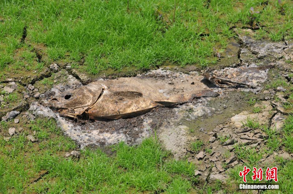 6月28日,由于连日来的干旱,日照水库水位告急,水库水域面积急剧减少,以荻竹涧村以北为界,水库西部只有几个水坑残存着少量的水,以东至水库泄洪闸门处尚存部分水。裸露出来的水库库底已经开始皲裂并长满野草,放眼望去绿油油一片宛如草原,随处可见一些死亡的鱼、河蚌等。中新社发 张磊 摄