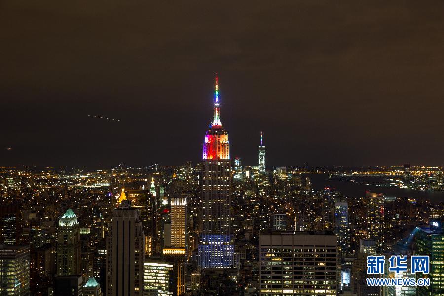 6月28日,在美国纽约曼哈顿,帝国大厦点亮彩虹灯庆祝同性婚姻合法。当日,纽约举行一年一度的同性恋大游行。美国最高法院26日以5比4的投票结果裁定,同性婚姻合乎宪法。这一裁决结果意味着同性婚姻在全美50个州全部合法。新华社记者李木子摄 图片来源:新华网