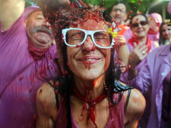 ↑6月29日,在西班牙阿罗,一名男子在“葡萄酒大战”中将酒倾倒在一名女孩头上。新华社/法新